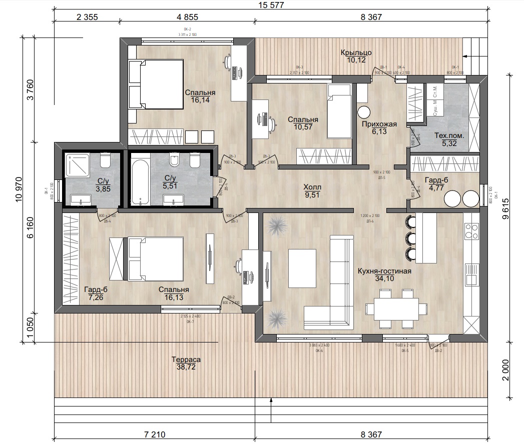 | Не включено: | окна, двери, доставка домокомплекта, дополнительные затраты на фундамент, сопутствующие расходы на подрядные работы | ||