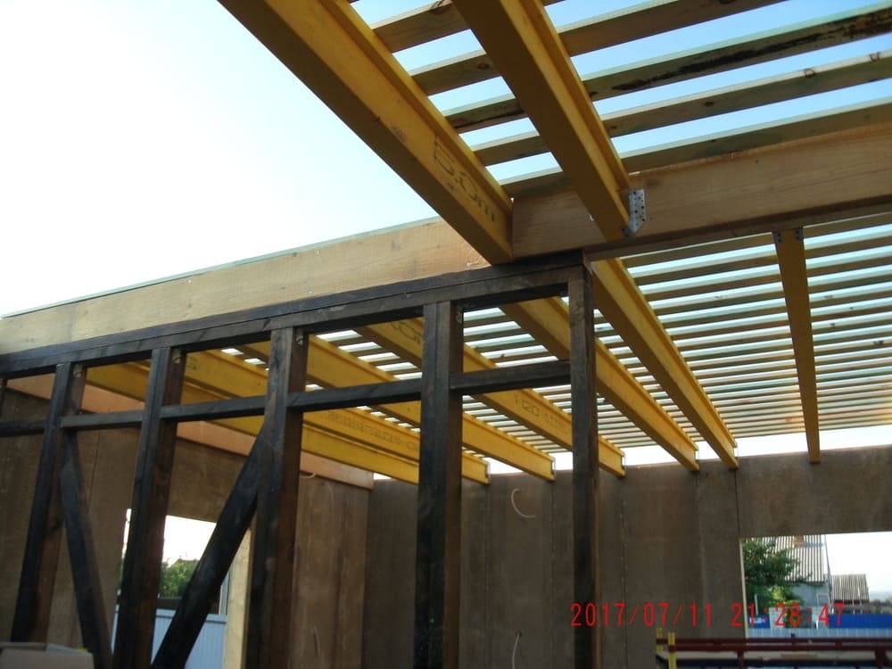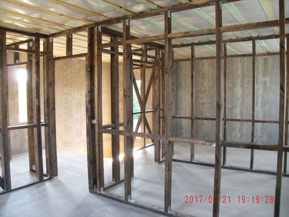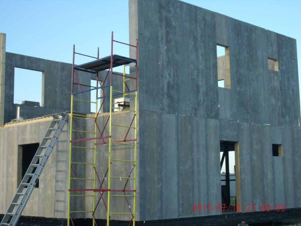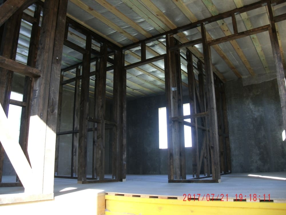 из СИП панелей из ЦСП размером 2700*1200*168 мм с антисептированным калиброванным пиломатериалом камерной сушки (46*140 мм). Монтаж каркасов несущих перегородок из пиломатериала 38*89 мм (76*89 мм).