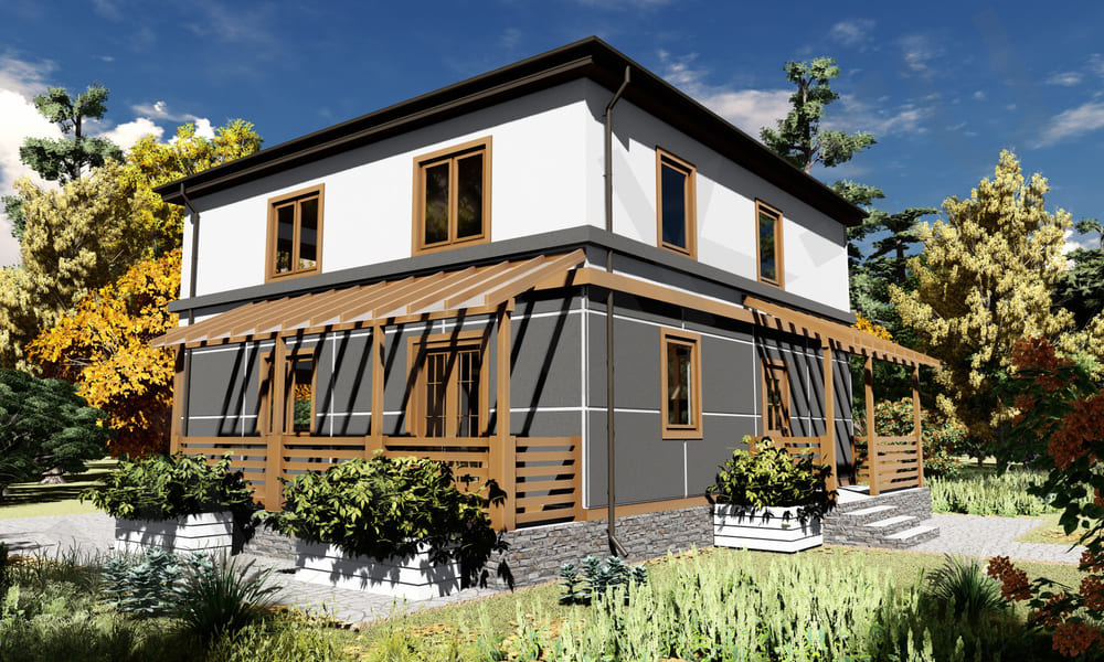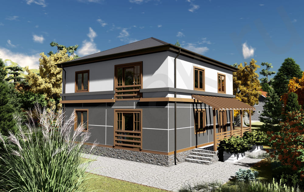 • Плоская или скатная утепленная кровля (пароизоляционная пленка, утеплитель вата на основе стекловолокна или базальта, гидро-ветрозащитная мембрана) с покрытием из металлочерепицы, полимерной мембраны или гибкой черепицы. (цена отличается от выбранного типа) (Ширина карнизного свеса от 30 см. Водосточная система в стоимость не входит